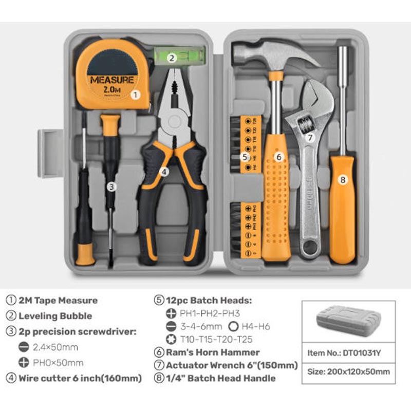 मार्शिन 20पीस मैनुअल हाइड्रोलिक हार्डवेयर टूल सेट में दो समर्पित सटीक स्क्रूड्राइवर हैं जो इलेक्ट्रॉनिक्स या खिलौनों में छोटे फास्टनरों से निपट सकते हैं, जबकि 160 मिमी तार कटर तांबे के तारों या प्लास्टिक-लेपित तारों को साफ करने में सक्षम है। और टूल सेट में सटीक लंबाई जांच के लिए 2.0M टेप माप, सीधे इंस्टॉलेशन सुनिश्चित करने के लिए एक लेवलिंग बबल, नट के लिए 150 मिमी एक्चुएटर रिंच और हल्के टैपिंग या कील कार्य के लिए एक रैम हॉर्न हथौड़ा भी शामिल है।